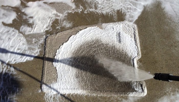 Rửa kỹ lại bằng xà phòng: Bắt đầu trên một cạnh của thảm sàn và đẩy xà phòng suốt trên thảm. Lặp lại việc rửa cho đến khi nước xà phòng không còn nữa trên bề mặt của thảm.